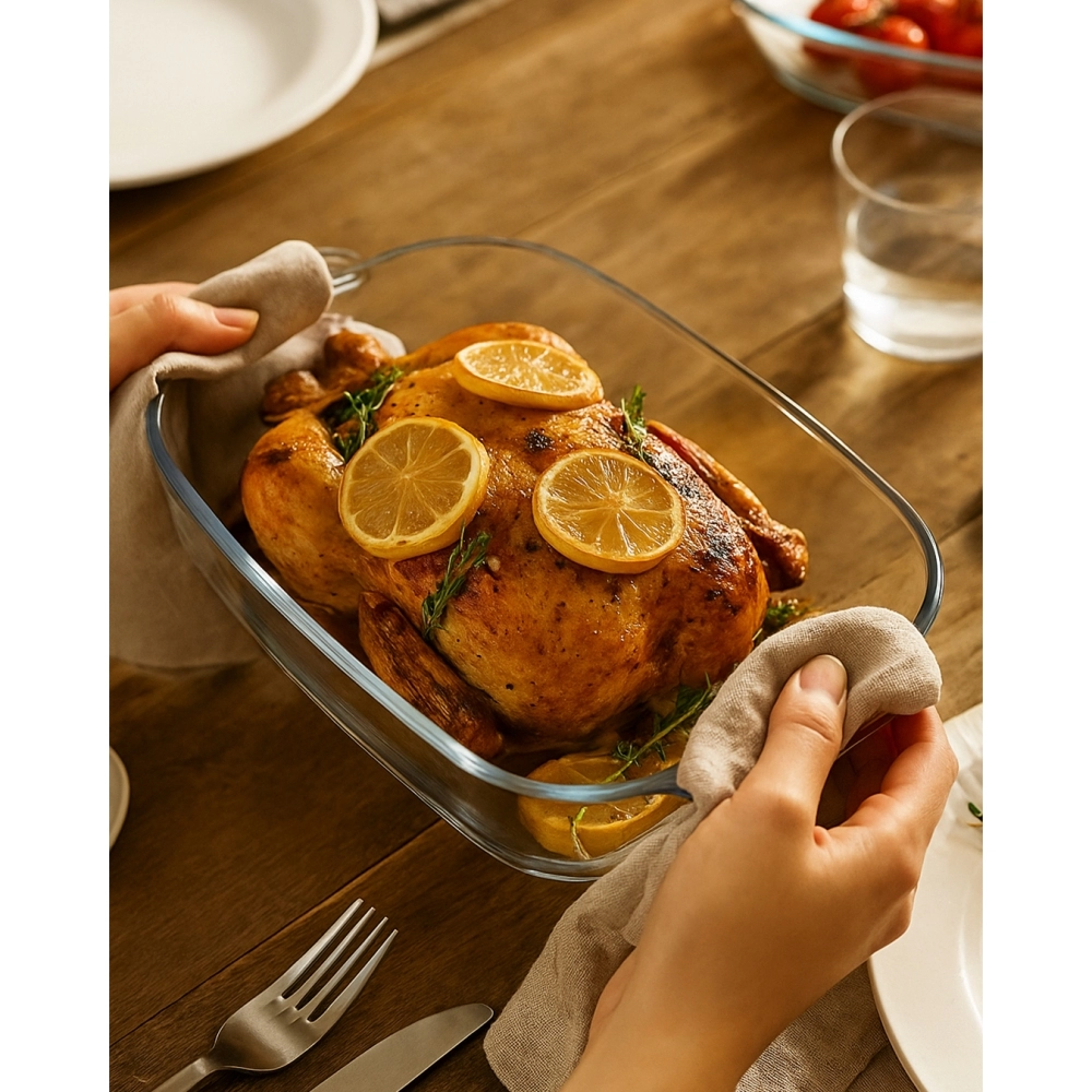 Feita em vidro borossilicato de alta qualidade, suporta altas temperaturas e variações de calor, oferecendo maior segurança no preparo de receitas. Com capacidade de 2700ml, é ideal para assados maiores, garantindo praticidade no dia a dia e um design elegante para servir à mesa.