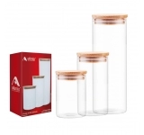 Este link contém: o Conjunto com 3 Potes de Vidro Borossilicato Redondos com Tampa de Bambu Allmix, uma combinação perfeita entre funcionalidade, resistência e elegância natural, ideal para lojas de utilidades domésticas, supermercados, restaurantes, buffets e hotéis que valorizam produtos com design sofisticado e apelo sustentável.