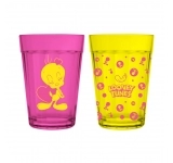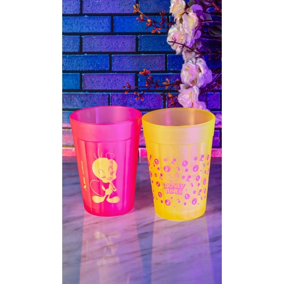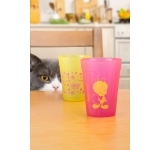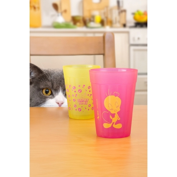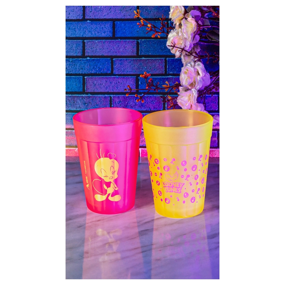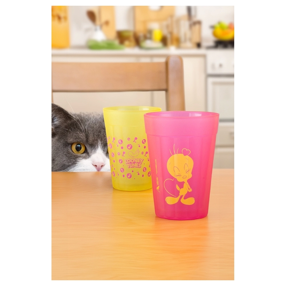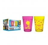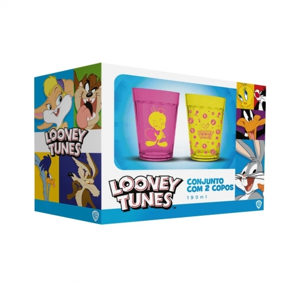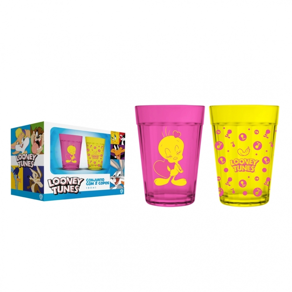 Coleção inspirada nos personagens da Looney Tunes. Produto produzido em vidro com acabamento fosco. Disponível nas cores rosa e amarela com estampa do Piu Piu. Possui 190ml, ideal para servir água, sucos e bebidas em geral.