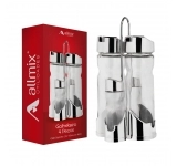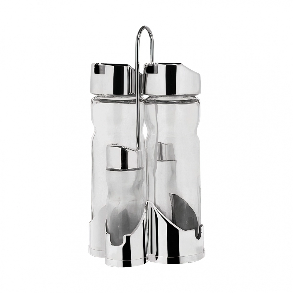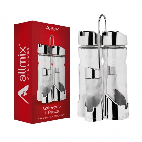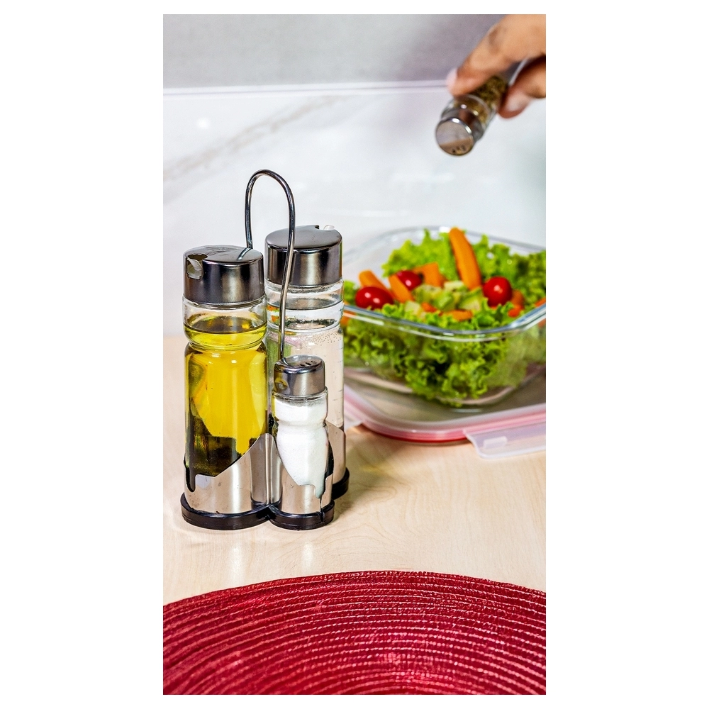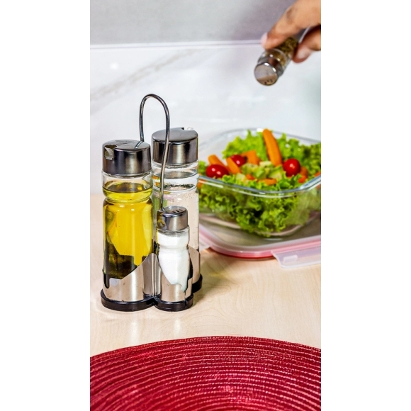 Feito de vidro de alta qualidade, o kit é durável e resistente, além de ter um design elegante que complementa qualquer ambiente. Acompanhado de um suporte, ele mantém seus condimentos organizados e à mão, tornando-o perfeito para restaurantes, bares ou até mesmo para uso diário em sua casa.