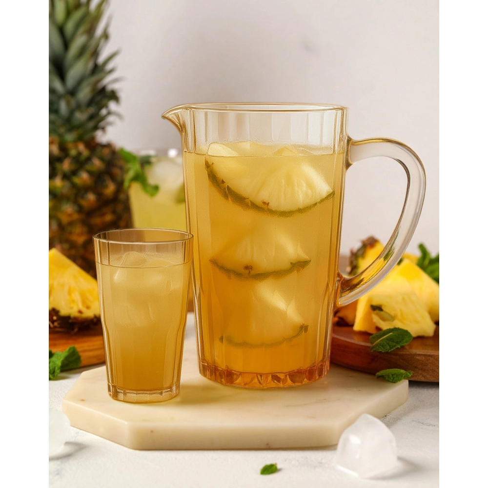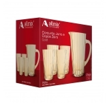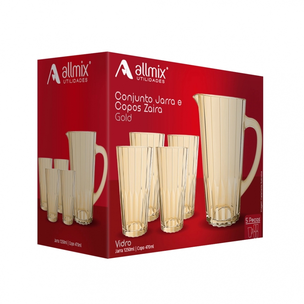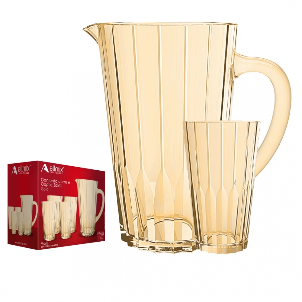Este link contém: o Conjunto Zaira Gold com 1 Jarra 1250ml e 4 Copos 470ml, um kit elegante e versátil que combina sofisticação, funcionalidade e estilo em cada peça.