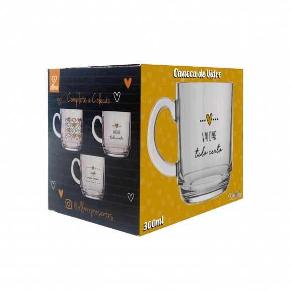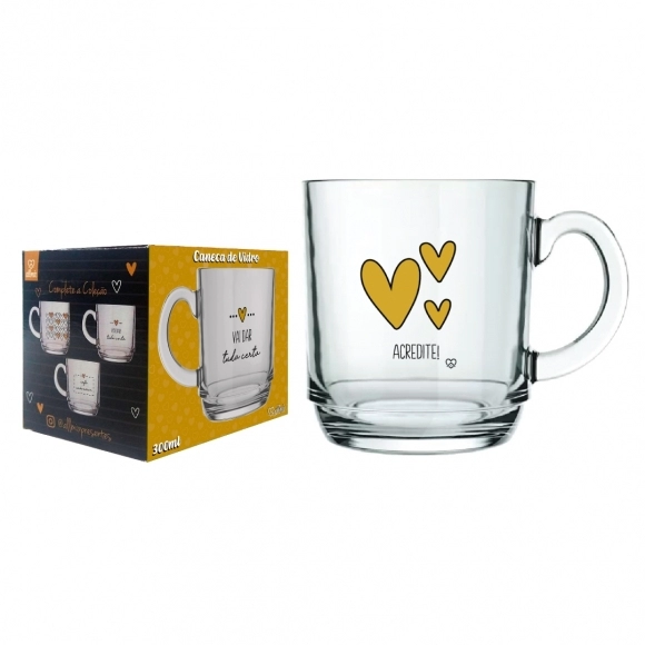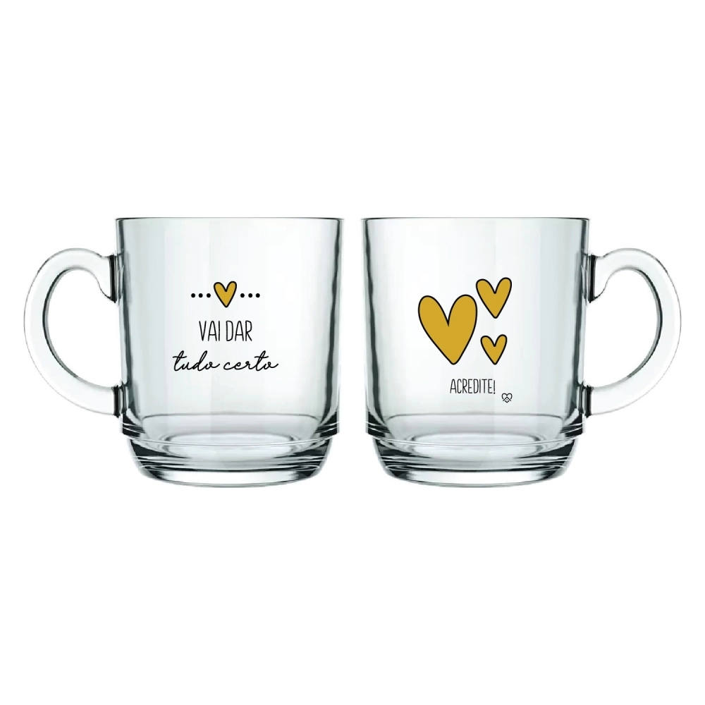 Com a Coleção Love, o amor é celebrado todo dia! Possui design exclusivo e apaixonante! Produzida em vidro incolor com corações decorativos e os dizeres "Tudo vai dar certo. Acredite". Possui 300ml, ideal para bebidas quentes. Contém embalagem personalizada, sendo uma excelente opção para presentes.
