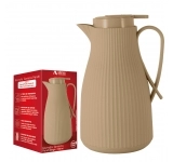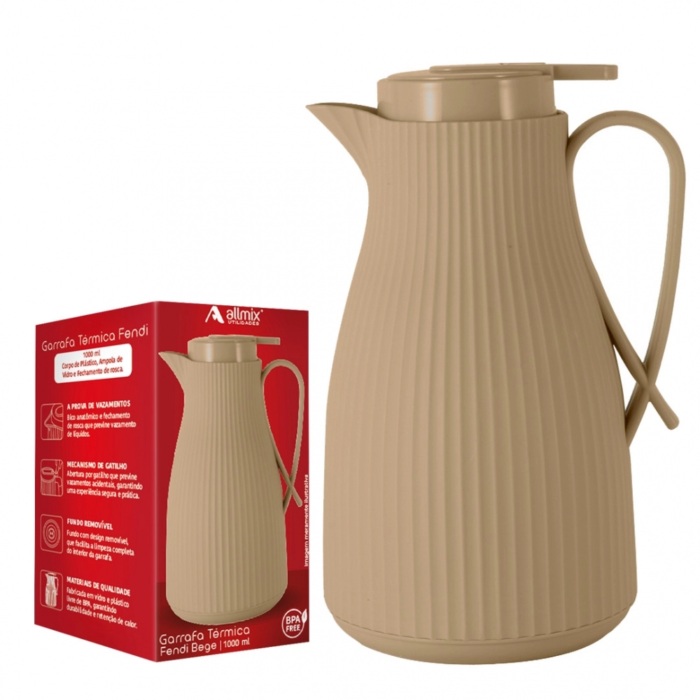 Este link contém: a Garrafa Térmica Fendi 1000 ml Bege, ideal para manter bebidas quentes ou frias com segurança, praticidade e estilo. Produzida em plástico resistente com ampola interna de vidro, tampa de rosca com anel de silicone e fechamento a vácuo, a garrafa possui bico anatômico que previne vazamentos e cabo de madeira com alça anatômica. O fundo antiderrapante proporciona maior segurança na superfície.