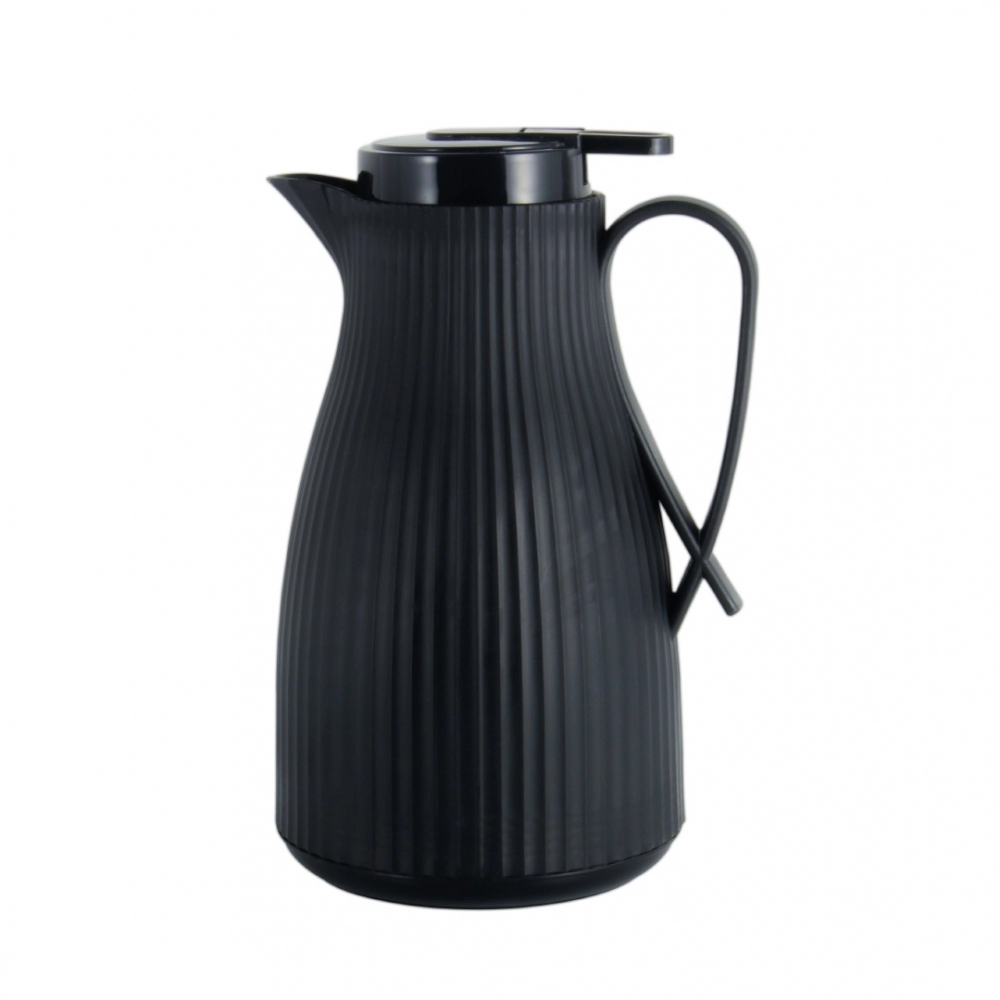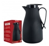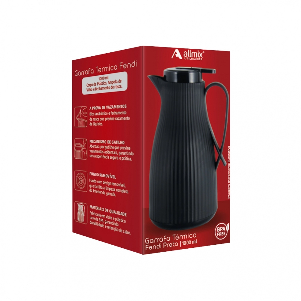 Este link contém: a Garrafa Térmica Fendi 1000 ml Preta, ideal para manter bebidas quentes ou frias com segurança, praticidade e estilo. Produzida em plástico resistente com ampola interna de vidro, tampa de rosca com anel de silicone e fechamento a vácuo, a garrafa possui bico anatômico que previne vazamentos e cabo de madeira com alça anatômica. O fundo antiderrapante proporciona maior segurança na superfície.
