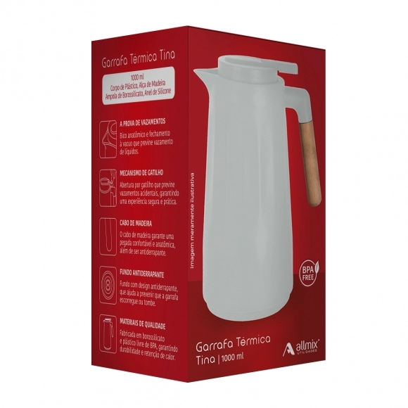Seu cabo em madeira natural proporciona um contraste elegante com o corpo em tom claro, além de oferecer firmeza e conforto ao servir. A Tina Cinza Claro é a escolha ideal para quem busca um acessório térmico com design contemporâneo e excelente desempenho.