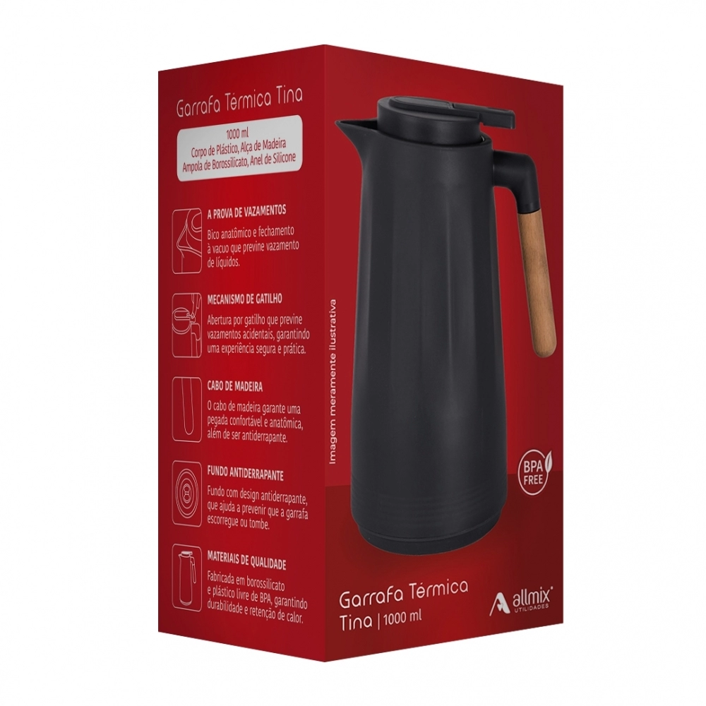 Diferenciais do Produto: BPa Free, Retenção de Calor seguindo instruções; Bico anatomico e fechamento a vácuo que previne vazamento; Mecanismo de Gatilho que previne vazamento; Cabo de Madeira com alça anatômica; Fundo antiderrapante, ajuda a não escorregar na superficie.