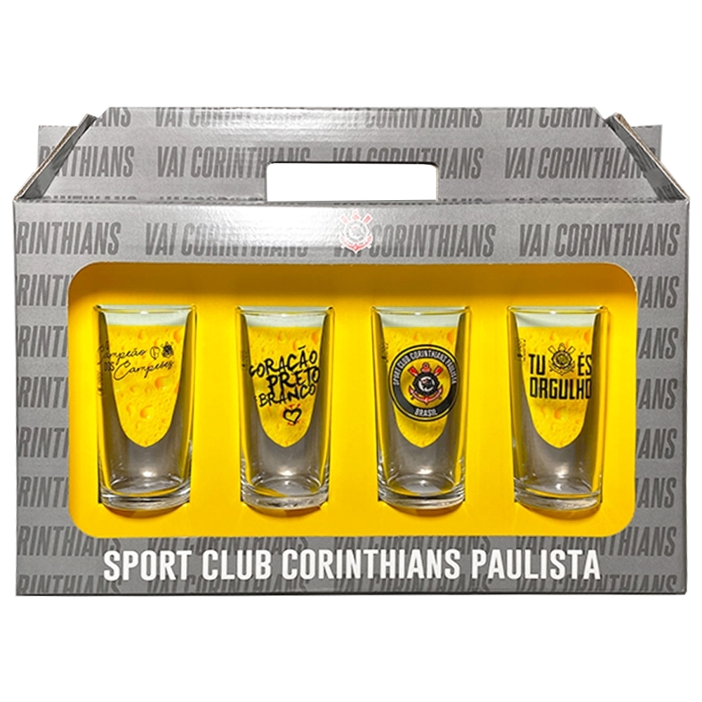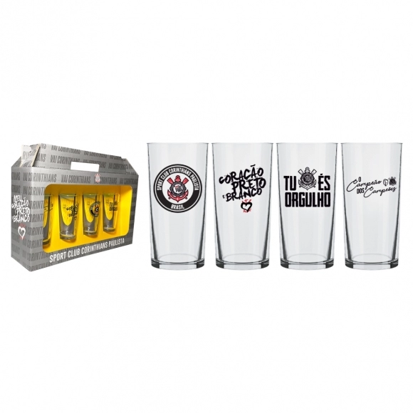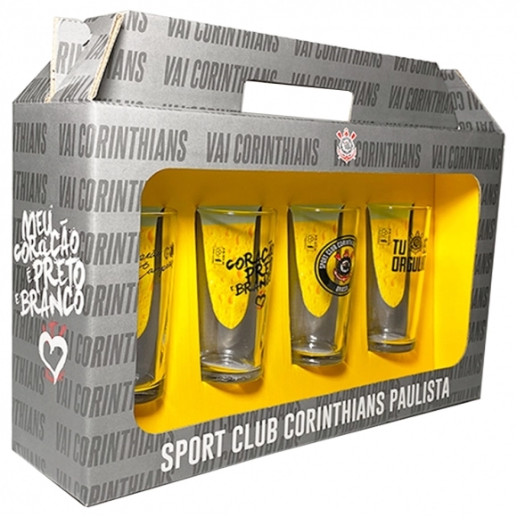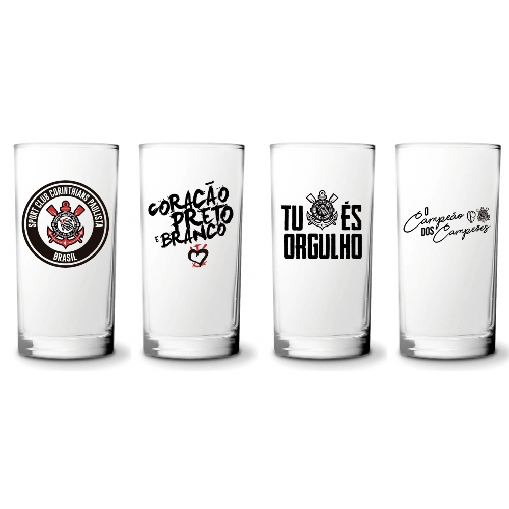 Coleção inspirada nos torcedores do Todo Poderoso Timão. Produzida em vidro incolor com acabamento estampado, possui 4 copos com frases em alusão ao timão. Possui 300ml, ideal para servir Sucos e bebidas em gerais. Contém embalagem personalizada, sendo uma excelente opção para presentes.