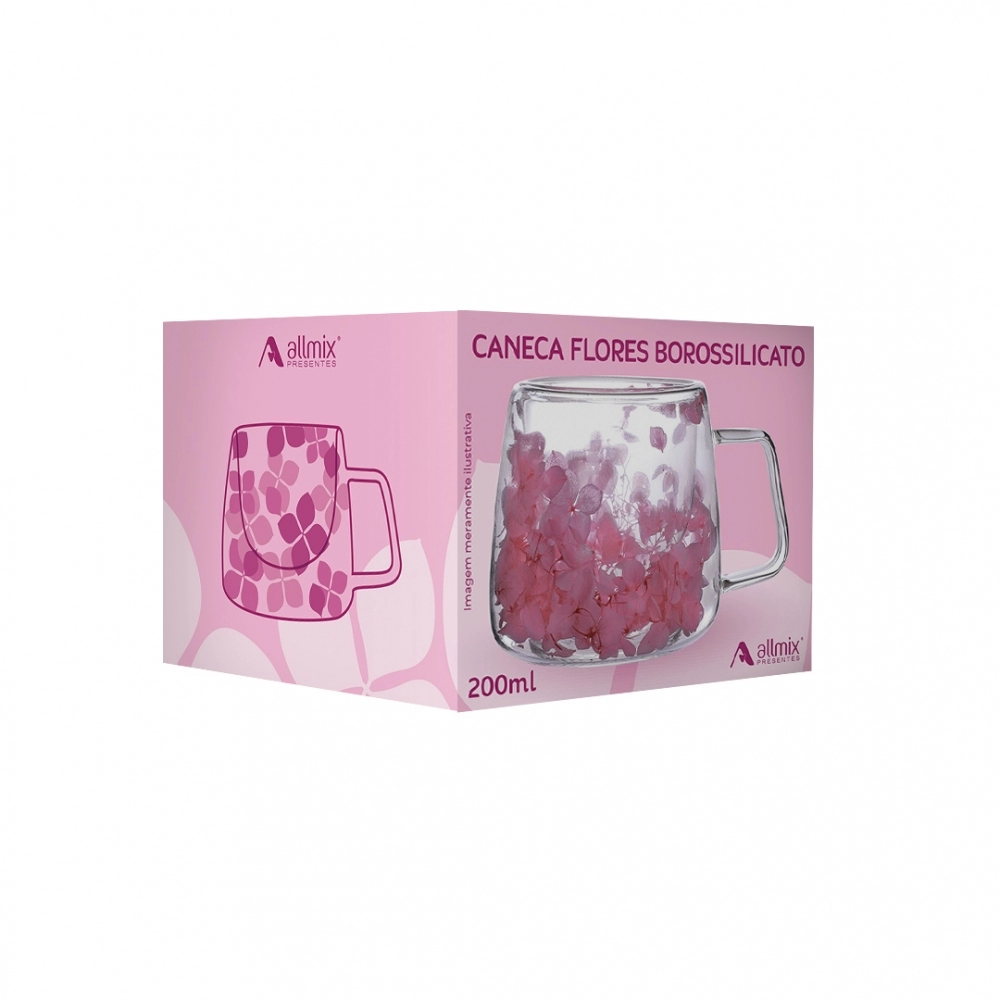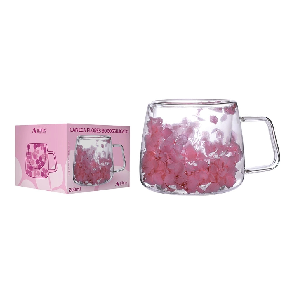 Produzida em vidro borossilicato com parede dupla, mantém a bebida na temperatura ideal por mais tempo e proporciona conforto ao segurar, sem aquecer as mãos. O detalhe exclusivo das flores secas encapsuladas encanta pelo charme artesanal, enquanto o acabamento em tom Pink transmite romantismo e sofisticação.