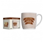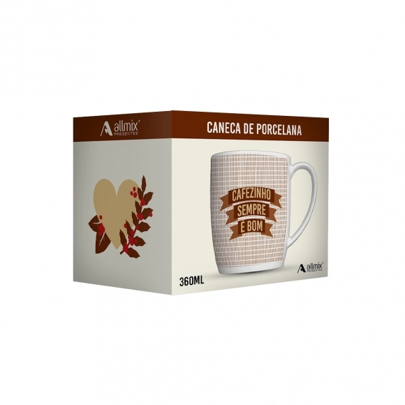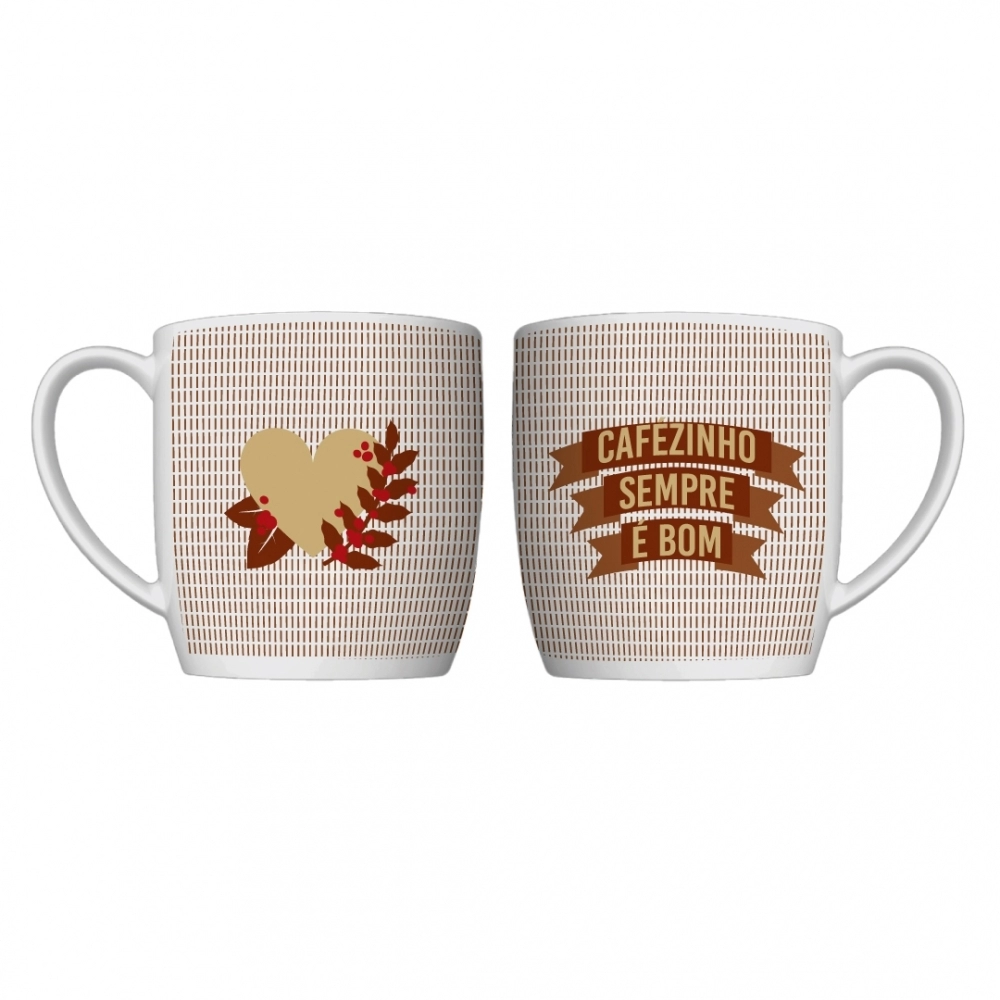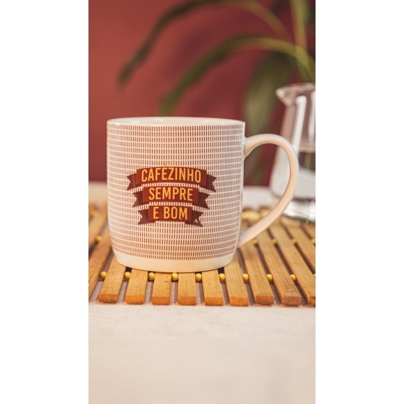 Produzida em porcelada com estampa "Cafézinho sempre é bom". Possui 360ml, ideal para servir bebidas quentes. Contém embalagem personalizada, sendo uma excelente opção para presentes.