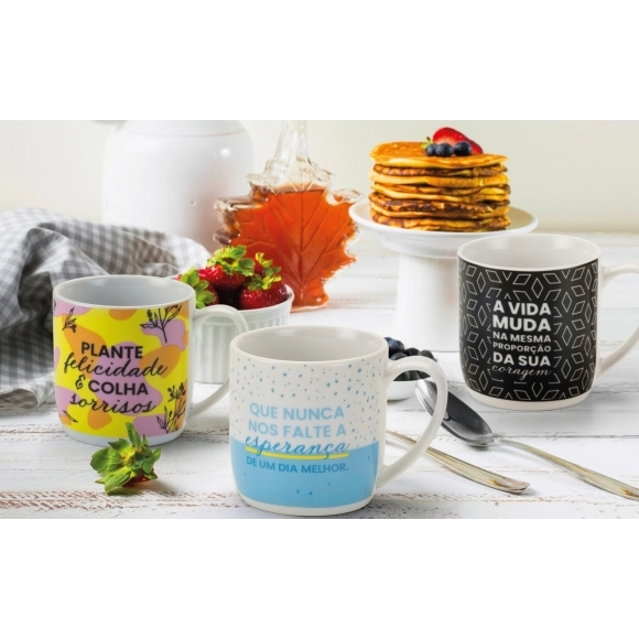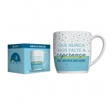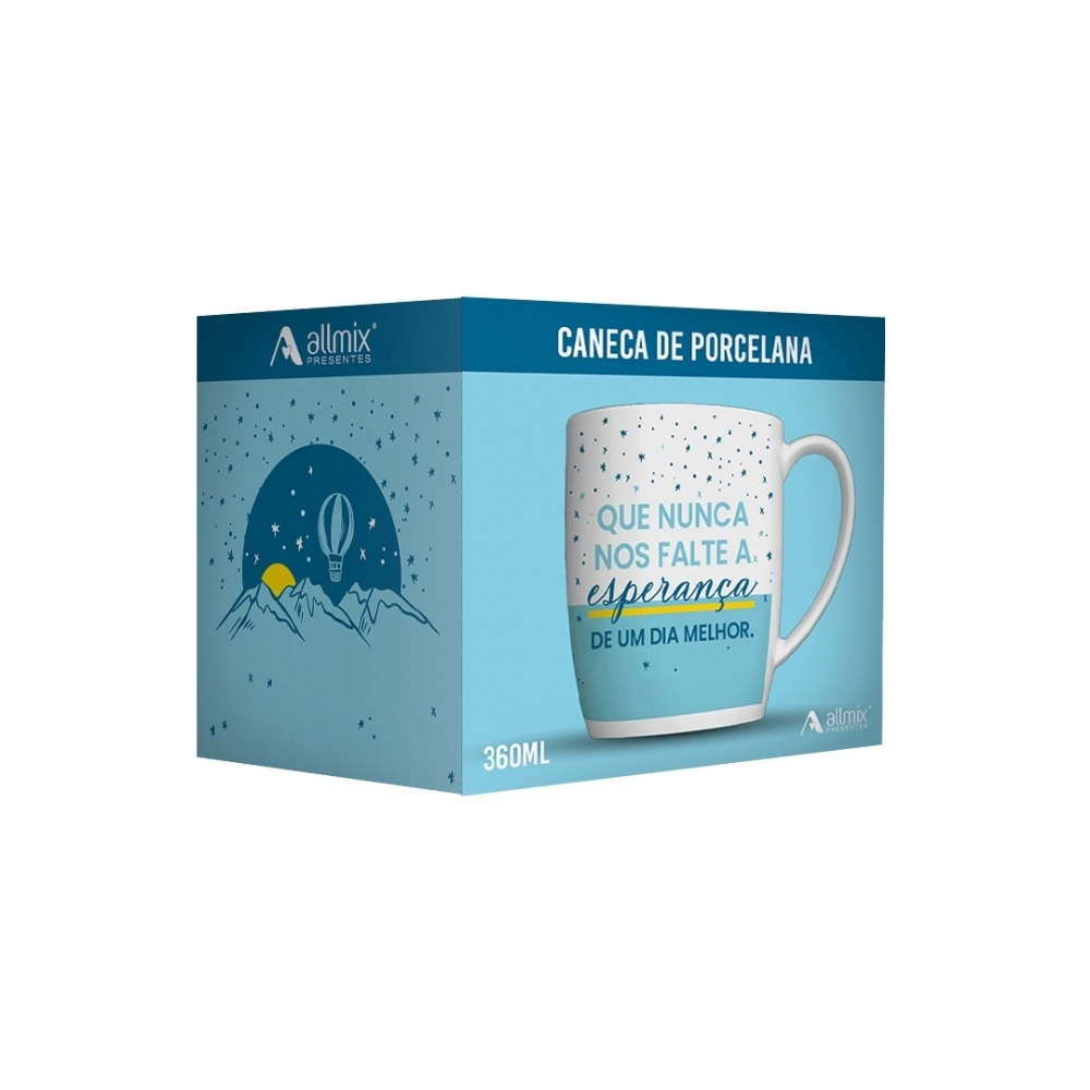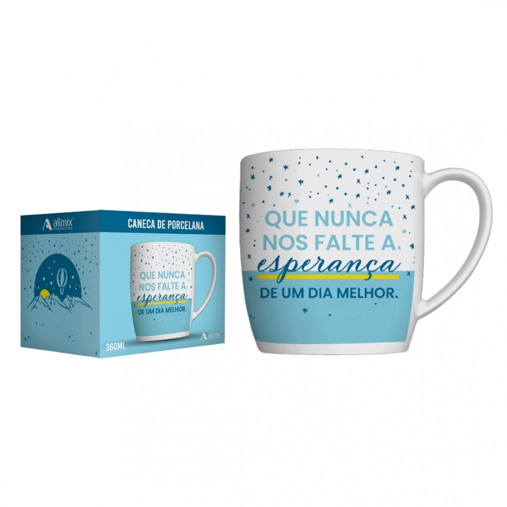 Produzida em porcelada com estampa "Que nunca nos falte a esperança de um dia melhor!". Possui 360ml, ideal para servir bebidas quentes. Contém embalagem personalizada, sendo uma excelente opção para presentes.