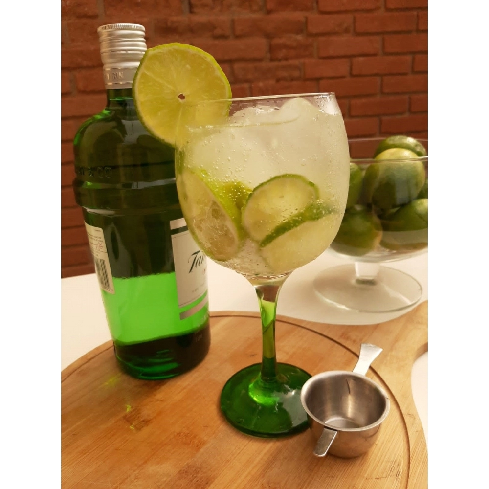 Produto produzido em vidro incolor, possuindo a base com acabamento na cor verde. Possui 615ml, ideal para servir drinks diversos.