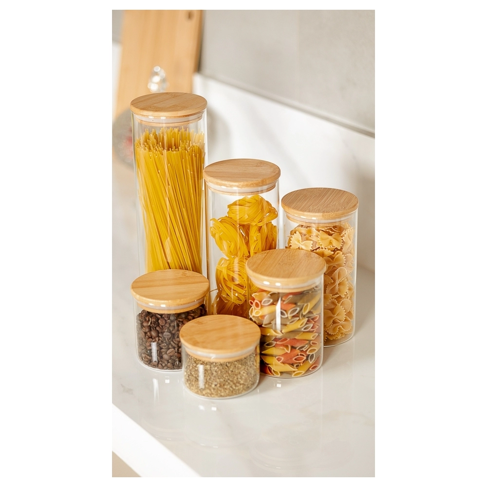 Transparente e Estiloso – A transparência do vidro permite fácil visualização do conteúdo, enquanto a tampa de bambu acrescenta um toque de sofisticação.